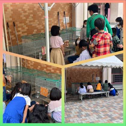 中庭だと子どもたちみんなが見やすく、早速うさぎ小屋の周りには人だかりが(^O^)/