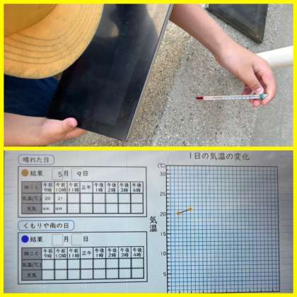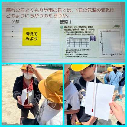 晴れの日、雨の日、曇りの日の気温の変化について温度計を使って気温を調べます。