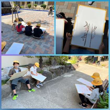 校庭の木の中からお気に入りの木を見つけて、写生をします。