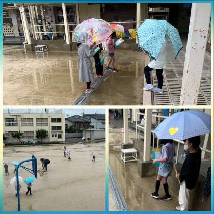 今日は雨の中でしたが、水のゆくえがよくわかる運動場での観察で水がどこへどのように流れているのかの観察をしていました。