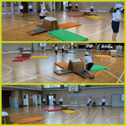 縦向き横向きの跳び箱が左右からできるようにセッティングし、自分に合う場で練習ができるようにしています。子どもたちは、意欲的に練習に取り組んでいました!