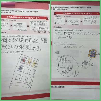 グループでかけ合わせるとどんな願いがかなえられるかを考えて、お菓子の開発をしました。子どもたちなりにいろいろ考えてたくさんのアイデアが出ていましたよ🌝