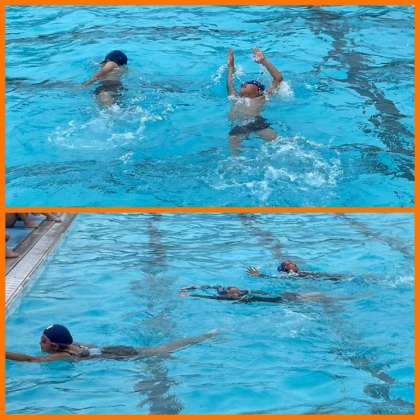 上を向いてしまうような子もいますが、体を傾ける練習なのでそれを繰り返してクロールがスムーズにできるようにしています。