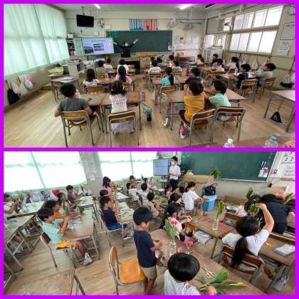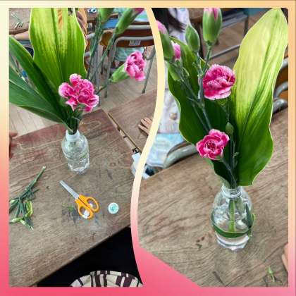 2年生が生け花!?と思うかもしれませんが、子どもたちの自由な発想でカーネーションの生け花に挑戦しました🌼