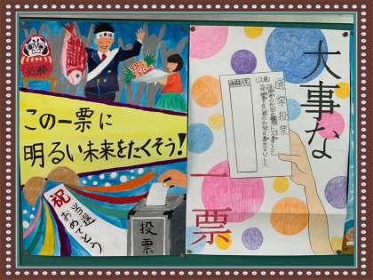 1学期の社会の学習で日本の選挙の投票率が低いことを学習し、少しでも選挙に興味を持ってくれる人が増えるようにそれぞれの思いを絵に表しました。