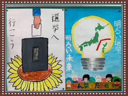 子どもたちは事前学習として夏休みに選挙ポスターを作成しました。
