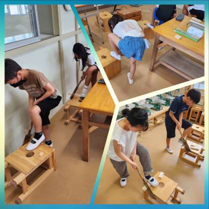 4年生が図工の授業で初めて、のこぎりに挑戦しました。