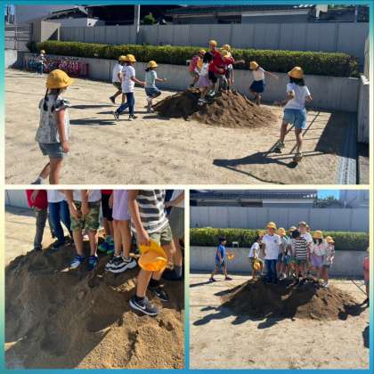さっそく、休み時間になると多くの子どもたちが砂山の上に!