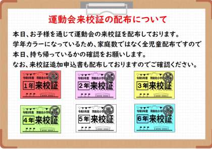 運動会来校証 配布しました!