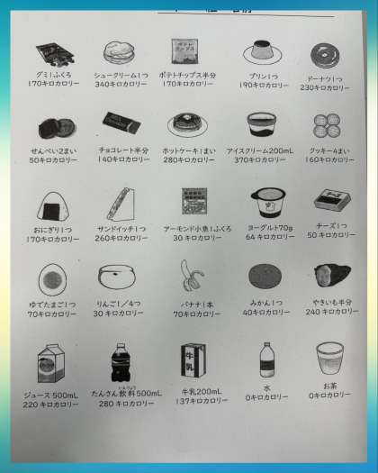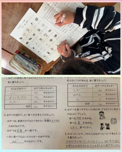自分でワークシートを見ながら選んだおやつと、そのエネルギー量について考えました。