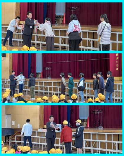 久しぶりの児童朝会では、月曜日の休みが続きできていなかった表彰式を行いました。
