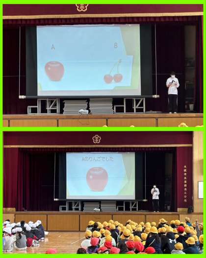 今日の児童集会は、拡大された画像が何か当てるクイズでした。