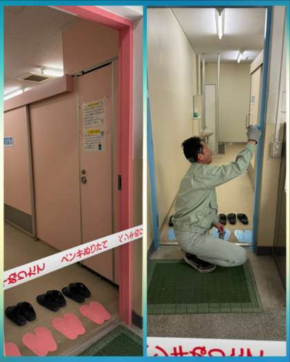 トイレが綺麗な環境で使えるように、管理作業員さんがペンキで色を塗り直し、スリッパも綺麗に並べられるように足型を描いてくれたり…