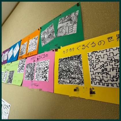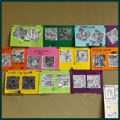4年生の教室の壁面には「カクカクぐるぐるの世界」という作品が掲示してあります!