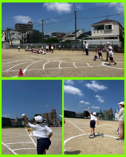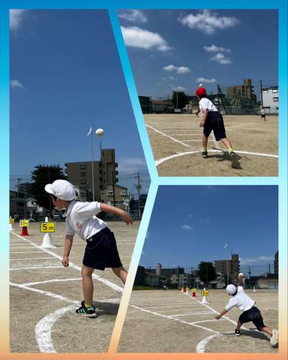 片手で握るには少し大きめで少し重いソフトボールです。1年生は初めてながら、力いっぱいに投げることができていました!