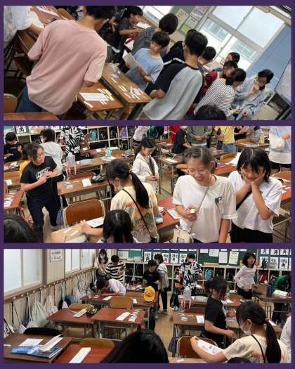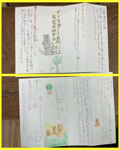 6年生の国語教材「イースター島にはなぜ森林がないのか」の仕上げとして、それぞれがまとめにリーフレットを作り、それを他のクラスの分も見合いをして感想を書いていきました。
