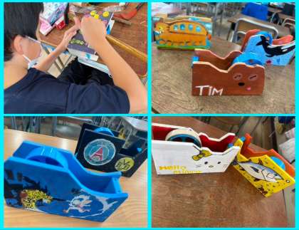 6年生が図工の授業でテープカッター作りをしました!自分の好きなイラストと形にデザインして仕上げました。電気ノコギリを使って木を切り、最後は釘で打ち付けて完成!