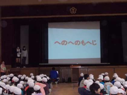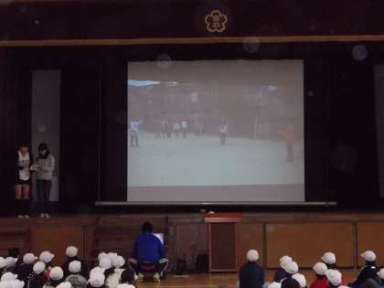 今日の児童朝会は運動委員会の委員会発表でした。