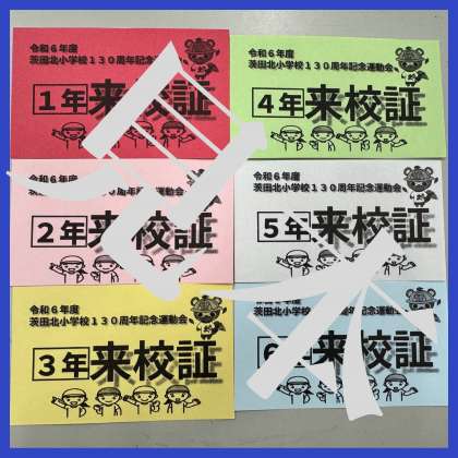 学年ごとに色が違います。児童席に入っての観覧の場合は学年カラーの来校証着用者のみとなっていますので、無くさないようにしてください。