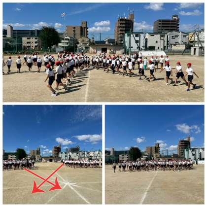 6年生の団体演技では、集団行動という隊形移動が入ります。風車のように回ったり、列が交差したり、↓のように入れ替わったり…