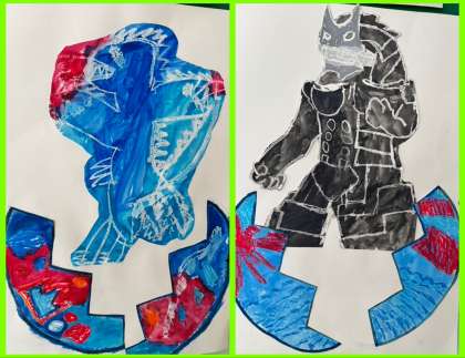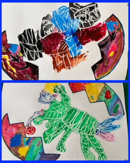 「ふしぎなたまごから 生まれた ふしぎな生きもの」というテーマでクレパスと絵の具を使って作品を仕上げています!