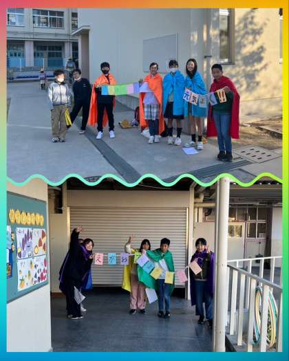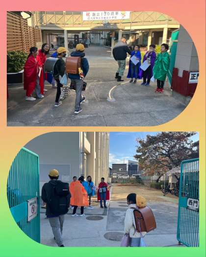代表委員のあいさつマン達が登校時間に門に立って