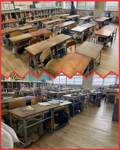地震の際は机の下に身を隠して自分を守ること、地震がおさまれば、広い安全な場所に避難すること、津波の時は高い場所(学校では3階以上)に避難することの訓練をしました。
