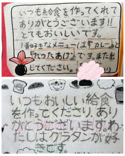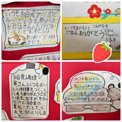 子どもたちの1番身近で給食を提供してくれている給食調理員さんへ向けて、各学級で感謝のメッセージをプレゼントしました。