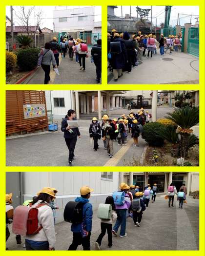 災害時や緊急時に同じ地域の人たちと一緒に帰れるように、班で集まりメンバーを確認したり帰り道を確認したりしました。班の担当の先生と一緒に帰る順序を確認しながら下校しました。