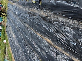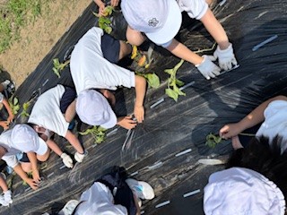 20日(火)親路の会の方と一緒にさつまいもの苗植えをしました。事前に親路の会(本校PTAのOB・OGさん)の方が畝を作りマルチングまでしてくださりました。