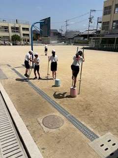6年生はサーキットのそれぞれの場所で運動に励んでいました。竹馬も上手に乗れています。