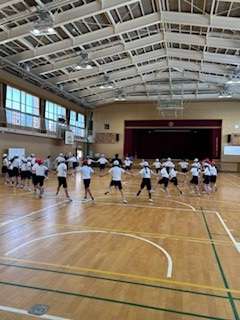 5年生は輪になって「マイムマイム」の学習。林間学習で成果を発揮したいですね。