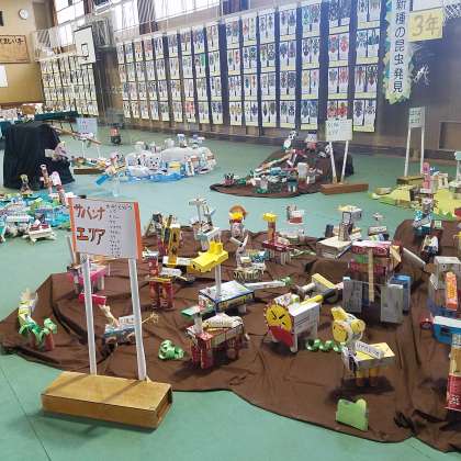 2学期の段階から作品の制作をはじめ、どの学年も趣向を凝らした作品が講堂に並んでいます。