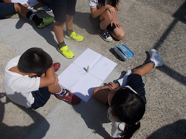時間ごとに変化する太陽とかげに驚きながら班で観察していました。