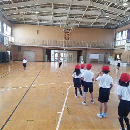 2年生の講堂での体育では跳び箱やマット運動をしています。跳び箱は苦手意識をできるだけなくして取り組めるように、導入の段階で感覚運動遊びを取り入れ、跳び箱の上部を両手でつく感覚や両足で踏み切る感覚を遊びの中でつけていっています。周りの友だちが一生懸命頑張っているのを見て、自然に声援の声が聞こえてきました。