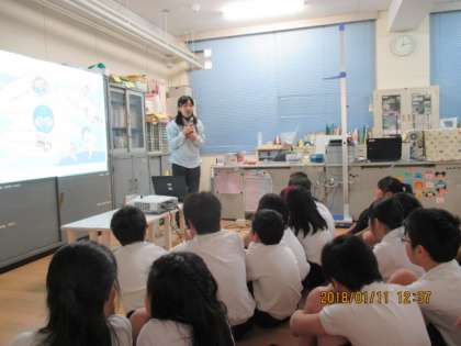 3学期に入り、保健室では各学級ごとに発育測定と「けんこう指導」が行われました。養護教諭、栄養教諭、担任が「めはいっしょうけんめい」の映像に合わせてセリフを話し、子ども達は楽しみながら目の健康について考えることができました。