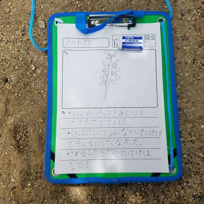 2年生の生活科ではミニトマトを育てています。毎日お水をあげて少しの成長も子どもたちは嬉しそうです。観察カードには見て分かることだけではなくて、茎のにおいや感触なども書いていました。