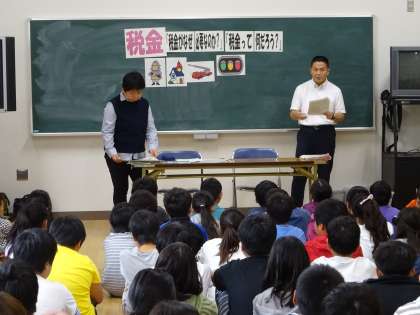 6年生が租税教室を行いました。税務署の方に来ていただき、「税金って何だろう?」「税金はなぜ必要なの?」ということをテーマに、税金について学習しました。最後には、1億円(見本)の入ったケースや、お札の束を持たせてもらい、貴重な経験ができました。