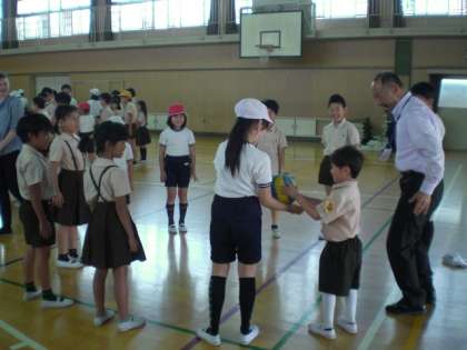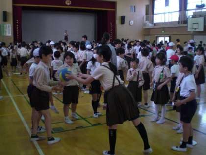 キッズファミリー(1年生から6年生の縦割り班)でボール回しゲームをしました。集会委員の「アーン パーンチ」の声でボールを止めます。早く早く!ドキドキしながら隣の人に回しました。お兄さんお姉さんが低学年の人に優しくボールを回す姿が印象的でした。