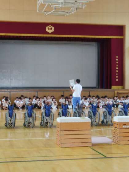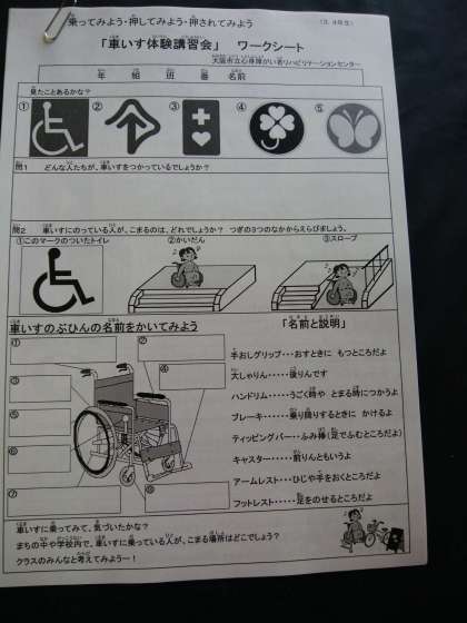 リハビリテーションセンターの皆さんに来ていただき車いす体験をしました。まずは、障がいのある人についての説明がありました。このマークどんな意味があったか覚えているかな?