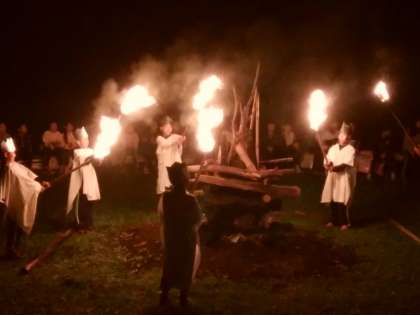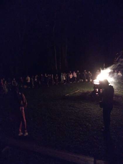 台風の影響で風が強かったですが、無事キャンプファイヤーを行いました。火の神と神の子が現れ、点火されました。初めてのキャンプファイヤーとは思えないくらい、いろいろなゲームや出し物をして楽しみました。