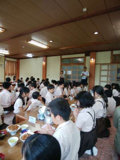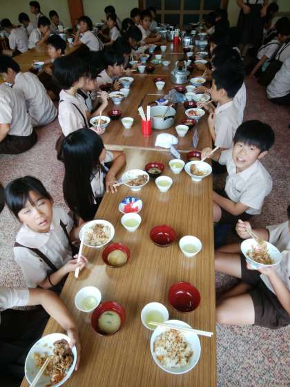 林間学習最後の食事となりました。メニューは牛丼です。11時すぎと時間は少し早いですが、しっかり食べています。