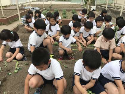 5月14日に植えたさつまいもの小さく細い苗が、今8月、花壇を葉がおおいつくしています。土の中でさつまいもが育っているかな。10月のおいもほりが楽しみです。