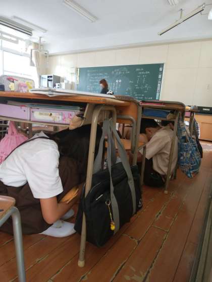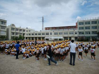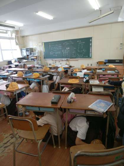 880万人訓練の防災行政無線の訓練放送を利用して鶴見小学校でも大地震発生の想定で避難訓練を行いました。