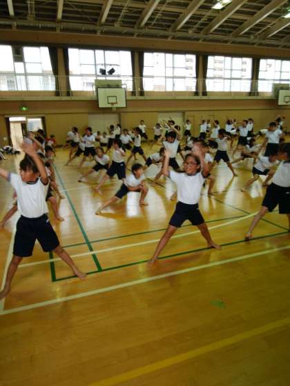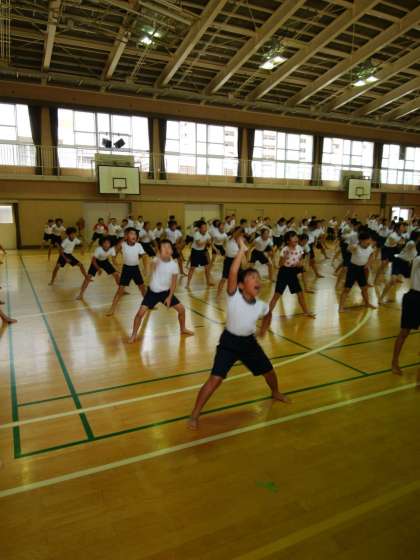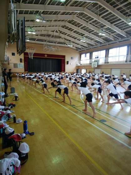 昼から雷雨のため、講堂に場所を移して5・6年合同で行いました。みんな真剣に取り組んでいて迫力があります。