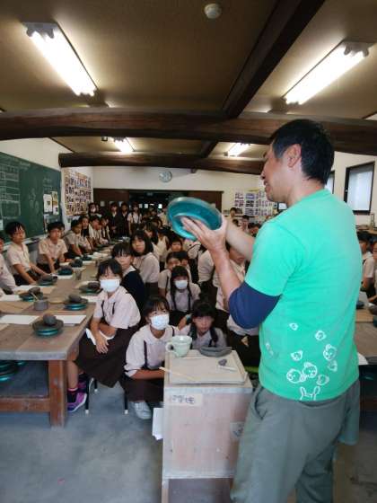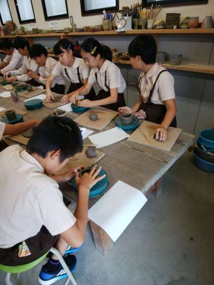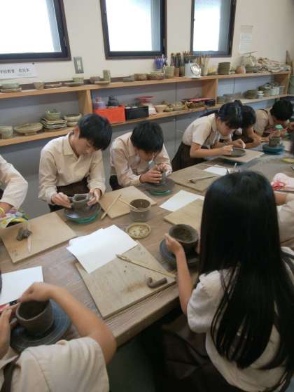 伊賀焼伝統産業会館に到着しました。作り方の説明を受けた後、それぞれ器の創作に取りかかりました。