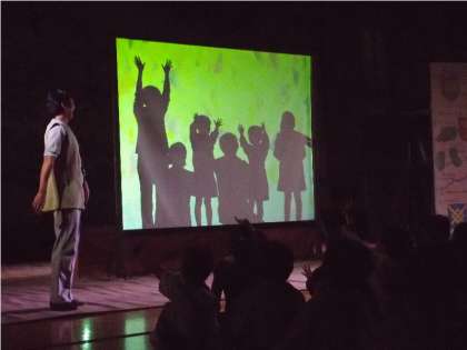 ワークショップでは、全員で影絵体験を行い、代表の児童や教員が前へ出て、実演しました。