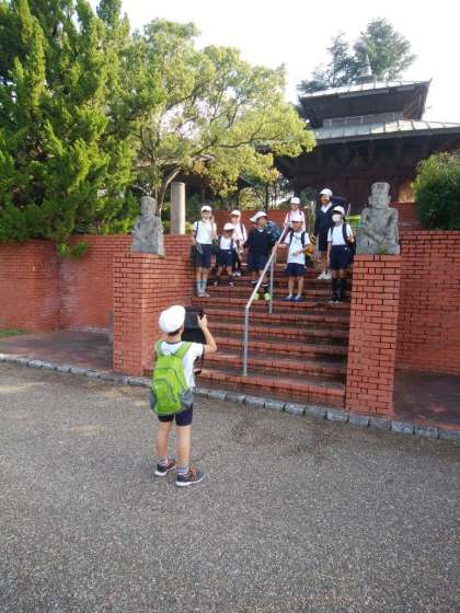 高学年は、低学年の児童の手をつないで歩いている班もありました。ポイントの場所に来ると写真を撮って行きます。