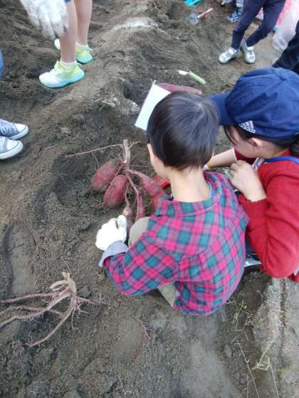 茨田小学校近くの農園でいもほりをしました。たくさんいもが取れました。その後、いもほり交流会が行われ、ゲームをして楽しみました。