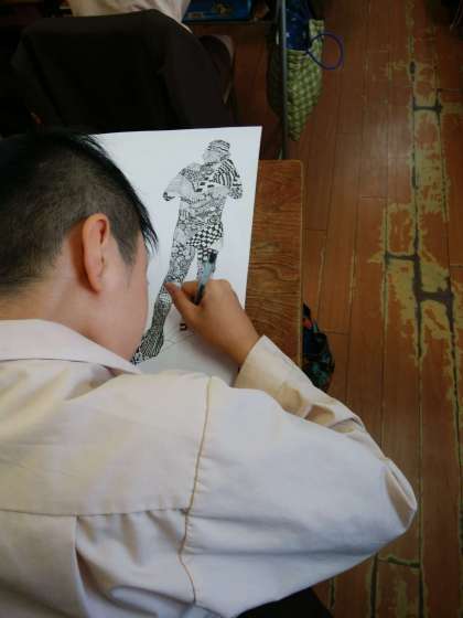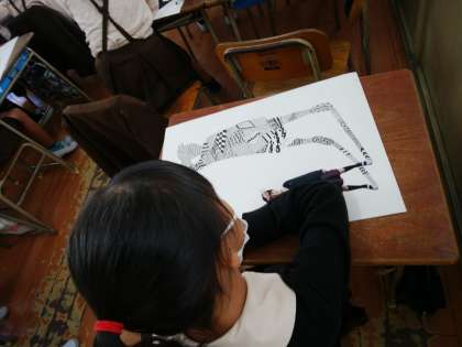6年生は絵画です。ゼンタングルというアメリカで生まれた技法で作品にしていきます。ゼンタングルとは模様やパターンを描き、それらを組み合わせていきます。